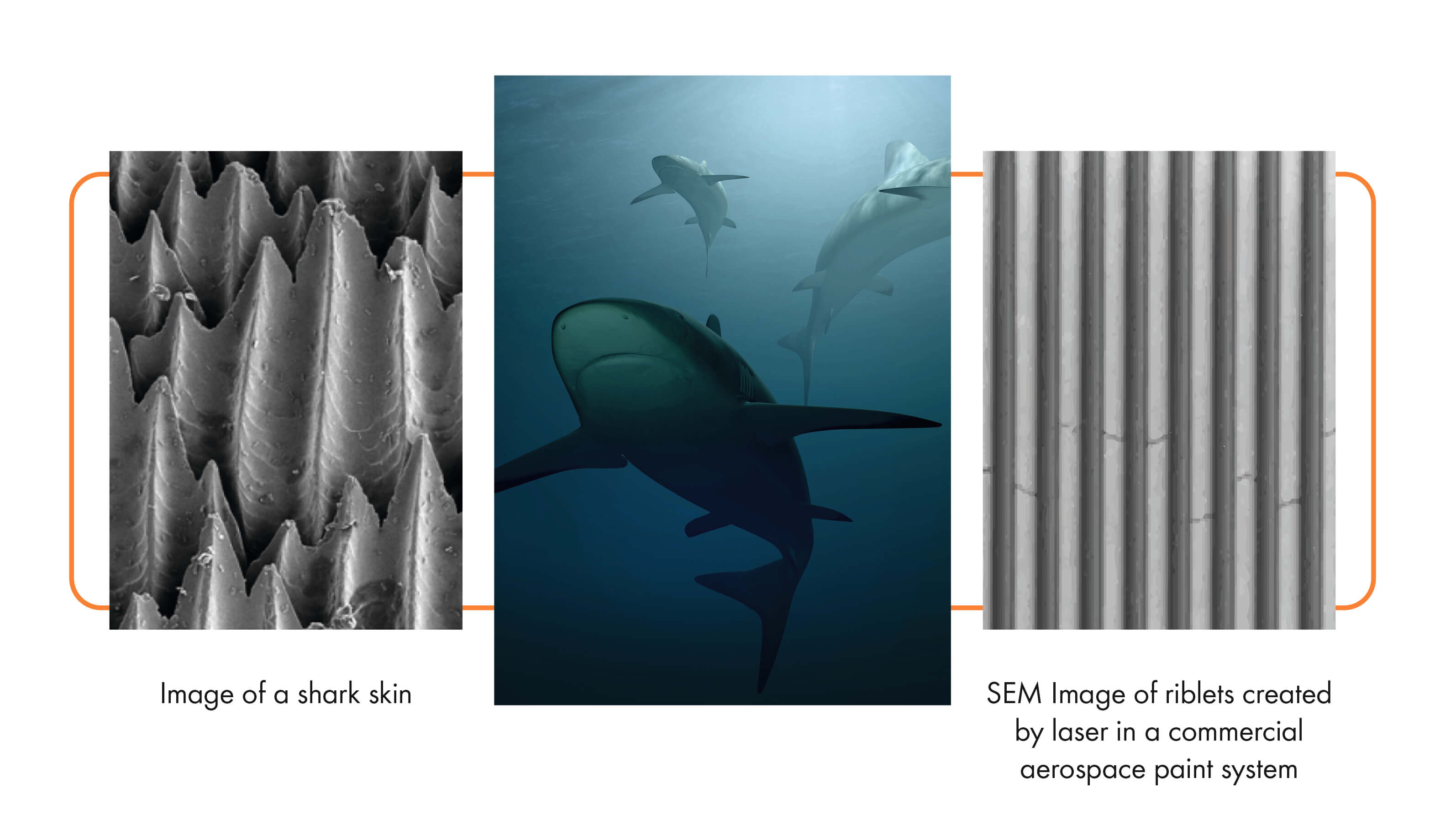 Riblet technology is inspired by the small grooves on the skin of a shark that help the fish travel more efficiently through the water. Riblet processing uses lasers to create customized micro-structures on an object or surface that decrease air and water resistance, and thereby increase energy efficiency. Riblets are highly effective in reducing drag in airplanes and other modes of transport, and have also demonstrated excellent potential for applications such as wind and gas turbines and other machines operating in very turbulent conditions.