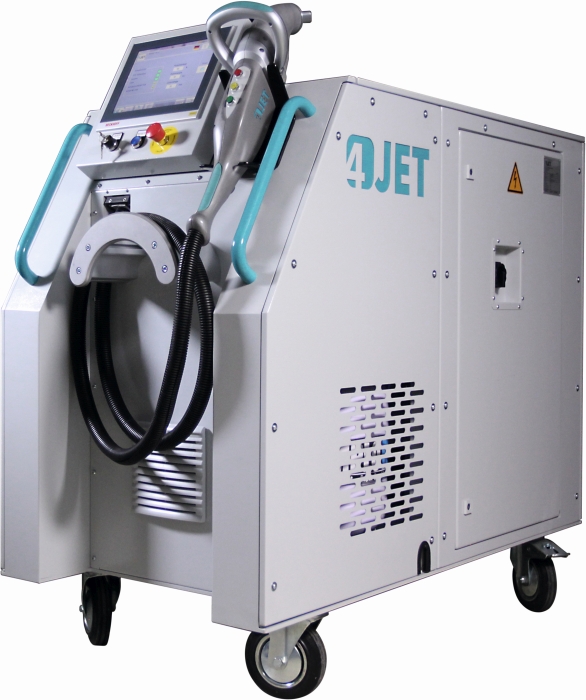Die fasergekoppelten, wartungsfreien Festkörperlaser sind in einen mobilen Fahrwagen integriert. Bei dem ergonomisch gestalteten Handstück setzt 4JET auf eine symmetrische Zweihandbedienung.
